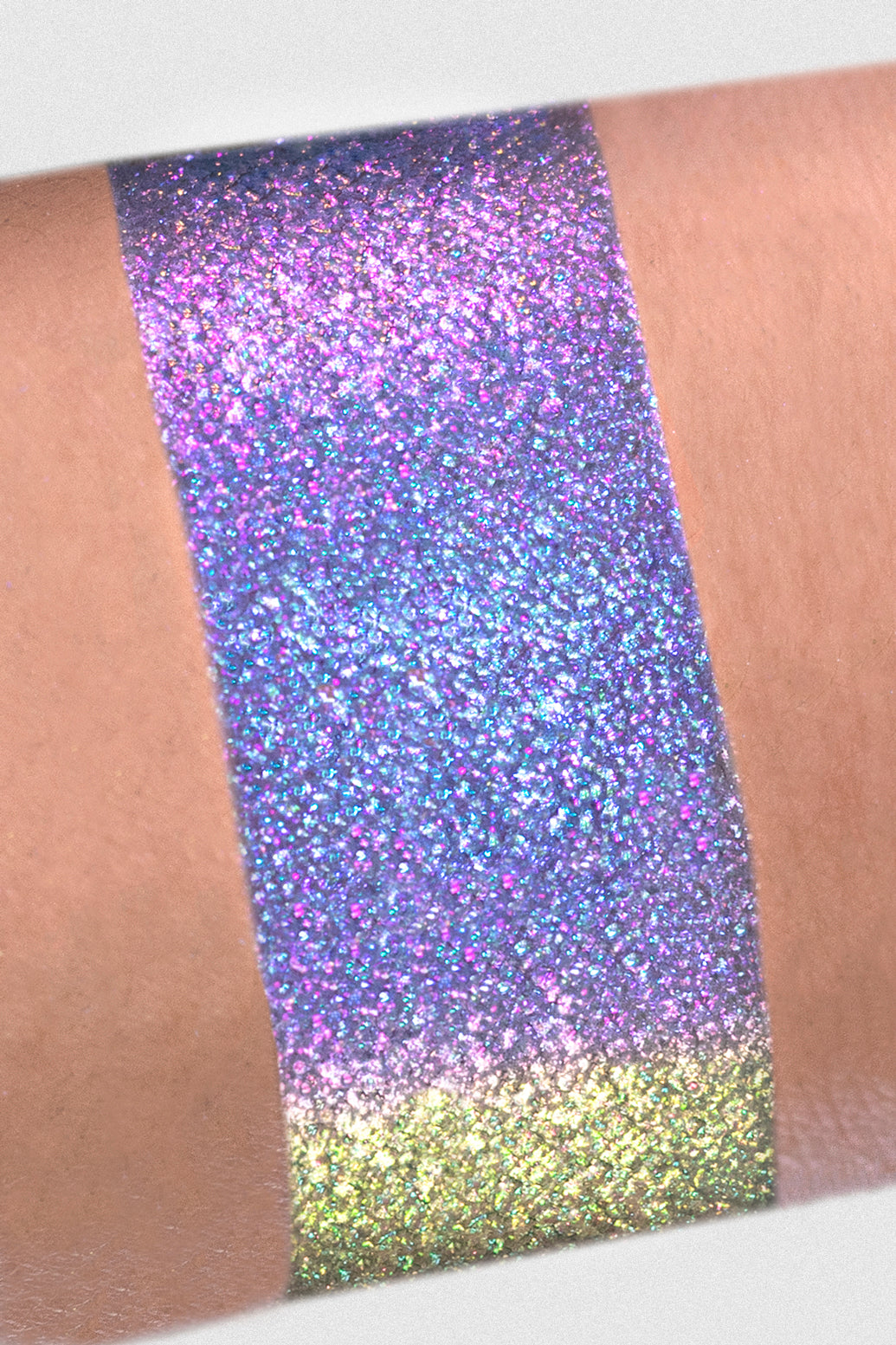 We recommends using a dense or flat brush with a tap or pat motion to apply the pigment over a sticky base, rather than swiping onto dry skin. Or use your brush wet then dip into the pigment so it grips to the brush, ensuring you get the best multi chrome effect onto the skin.